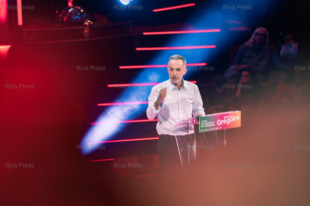 Légende : Meeting d'Emmanuel Gregoire, candidat socialiste à la tête de l'union de la gauche pour les municipales à Paris les 15 et 22 mars. Cirque d'Hiver Bouglione, Paris, 12 mars 2026. Teo Manisier / Riva Press /// Meeting of Emmanuel Gregoire, Socialist candidate leading the left-wing coalition for the Paris municipal elections on March 15 and 22. Cirque d'Hiver Bouglione, Paris, March 12, 2026. Teo Manisier / Riva Press