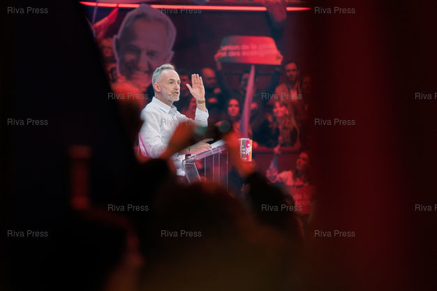 Légende : Meeting d'Emmanuel Gregoire, candidat socialiste à la tête de l'union de la gauche pour les municipales à Paris les 15 et 22 mars. Cirque d'Hiver Bouglione, Paris, 12 mars 2026. Teo Manisier / Riva Press /// Meeting of Emmanuel Gregoire, Socialist candidate leading the left-wing coalition for the Paris municipal elections on March 15 and 22. Cirque d'Hiver Bouglione, Paris, March 12, 2026. Teo Manisier / Riva Press