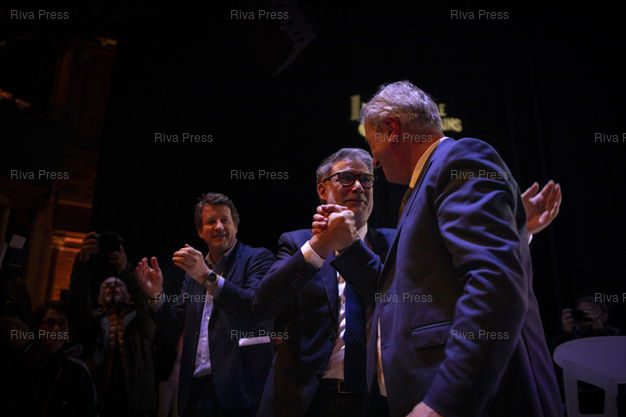 Légende : Toulouse, le 11 mars 2026 - Olivier Faure (C), premier secrétaire du PS, avec François Briançon (D) et Yannick Jadot (G), sénateur écologiste. Meeting de François Briançon, membre du Parti Socialiste qui mène la liste "Vivre mieux" de la gauche unie hors LFI à Toulouse pour les élections municipales de mars 2026. Photo: Vincent Nguyen / Riva Press ***
