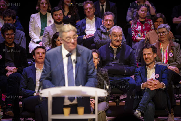 *** Toulouse, March 11, 2026 - Magyd Cherfi, writer and singer of the group Zebda, reacts to François Briançon's speech (at the microphone). Meeting of François Briançon, member of the Socialist Party who is leading the "Live better" list of the united left without LFI in Toulouse for the municipal elections of March 2026. Photo: Vincent Nguyen / Riva Press