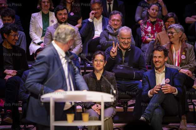 *** Toulouse, March 11, 2026 - Magyd Cherfi, writer and singer of the group Zebda, reacts to François Briançon's speech (at the microphone). Meeting of François Briançon, member of the Socialist Party who is leading the "Live better" list of the united left without LFI in Toulouse for the municipal elections of March 2026. Photo: Vincent Nguyen / Riva Press
