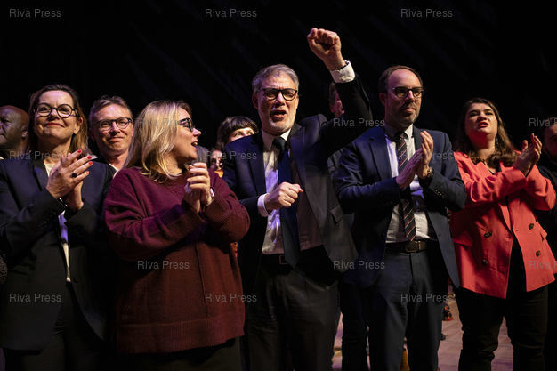 *** Toulouse, March 11, 2026 - Olivier Faure (C), first secretary of the Socialist party. Meeting of François Briançon, member of the Socialist Party who is leading the "Live better" list of the united left without LFI in Toulouse for the municipal elections of March 2026. Photo: Vincent Nguyen / Riva Press