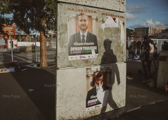 *** Toulouse, March 16, 2026 - Members of La France Insoumise (LFI) are distributing campaign leaflets for the "Demain Toulouse La Gauche Unie" (Tomorrow Toulouse United Left) list outside the Reynerie metro station in the Mirail district. This left-wing coalition is comprised of François Piquemal (LFI), who came in second, and François Briançon (Socialist, Communist, and Green Party), who came in third in the first round of the Toulouse municipal elections the previous day, March 15. This left-wing coalition aims to defeat the incumbent right-wing mayor, Jean-Luc Moudenc, who came in first. The alliance was announced that morning, and the new leaflets had just arrived from the printer. PHOTO: Vincent NGUYEN / Riva Press