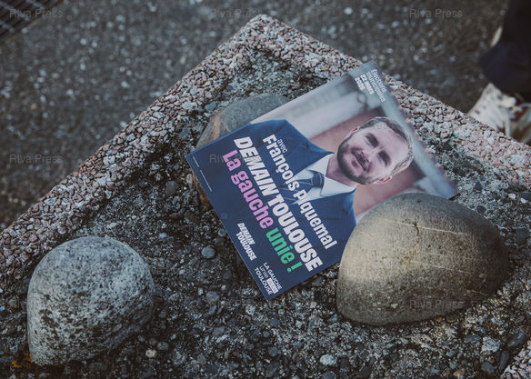 Légende : Toulouse, le 16 mars 2026 - Des militants de La France Insoumise (LFI) à la sortie du métro Reynerie dans le quartier du Mirail, distribuent des tracts électoraux de la liste Demain Toulouse La Gauche Unie, liste d'union de la gauche entre François Piquemal, LFI arrivé en deuxième place et François Briançon, union socialistes communistes, écologistes, arrivé en troisième place au 1er tour de l'élection municipale à Toulouse la veille, 15 mars. Cette liste d'union de la gauche est destinée à battre le maire sortant de droite Jean-Luc Moudenc, arrivé en première place. L'union a été annoncée le matin même et les nouveaux tracts viennent tout juste d'arriver de chez l'imprimeur. PHOTO: Vincent NGUYEN / Riva Press ***