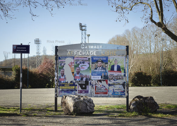 Légende : Carmaux, le 17 mars 2026 - Affiches électorales pour le second tour des élections municipales près du stade. À Carmaux entre les deux tours des élections municipales. PHOTO: Vincent NGUYEN / Riva Press