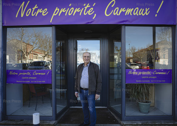 Légende : Carmaux, le 17 mars 2026 - Jean-Louis Bousquet, maire sortant de Carmaux devant sa permanence électorale. À Carmaux entre les deux tours des élections municipales. PHOTO: Vincent NGUYEN / Riva Press