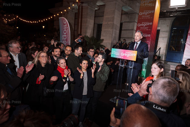 Légende : Emmanuel Gregoire, le candidat socialiste à la tête de l'union de la gauche pour les municipales de Paris, remporte l'election face a son opposante Rachida Dati (droite-centre) le 22 mars 2026. Paris, 22 mars 2026. Teo Manisier / Riva Press /// Emmanuel Gregoire, the Socialist candidate leading the left-wing coalition in the Paris mayoral election, defeated his opponent Rachida Dati (center-right) on March 22, 2026. Paris, March 22, 2026. Teo Manisier / Riva Press