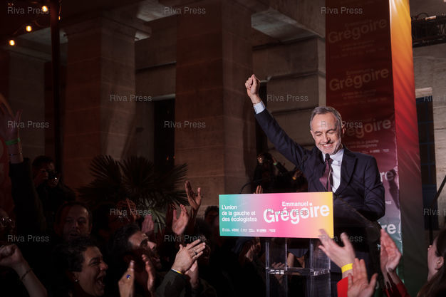 Légende : Emmanuel Gregoire, le candidat socialiste à la tête de l'union de la gauche pour les municipales de Paris, remporte l'election face a son opposante Rachida Dati (droite-centre) le 22 mars 2026. Paris, 22 mars 2026. Teo Manisier / Riva Press /// Emmanuel Gregoire, the Socialist candidate leading the left-wing coalition in the Paris mayoral election, defeated his opponent Rachida Dati (center-right) on March 22, 2026. Paris, March 22, 2026. Teo Manisier / Riva Press