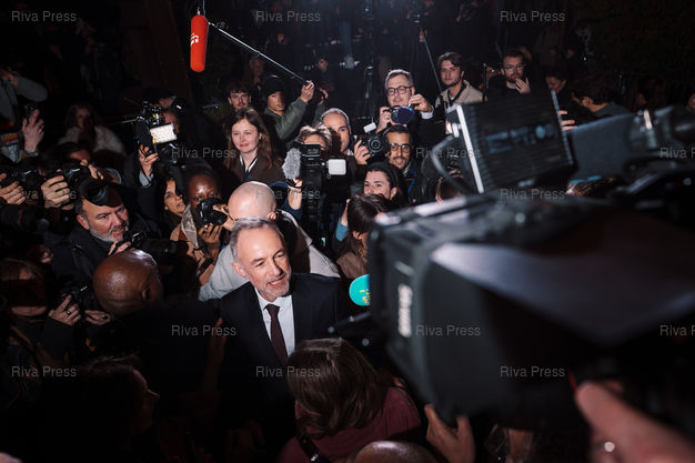 Légende : Emmanuel Gregoire, le candidat socialiste à la tête de l'union de la gauche pour les municipales de Paris, remporte l'election face a son opposante Rachida Dati (droite-centre) le 22 mars 2026. Paris, 22 mars 2026. Teo Manisier / Riva Press /// Emmanuel Gregoire, the Socialist candidate leading the left-wing coalition in the Paris mayoral election, defeated his opponent Rachida Dati (center-right) on March 22, 2026. Paris, March 22, 2026. Teo Manisier / Riva Press