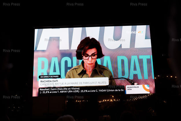 Légende : Emmanuel Gregoire, le candidat socialiste à la tête de l'union de la gauche pour les municipales de Paris, remporte l'election face a son opposante Rachida Dati (droite-centre) le 22 mars 2026. Paris, 22 mars 2026. Teo Manisier / Riva Press /// Emmanuel Gregoire, the Socialist candidate leading the left-wing coalition in the Paris mayoral election, defeated his opponent Rachida Dati (center-right) on March 22, 2026. Paris, March 22, 2026. Teo Manisier / Riva Press