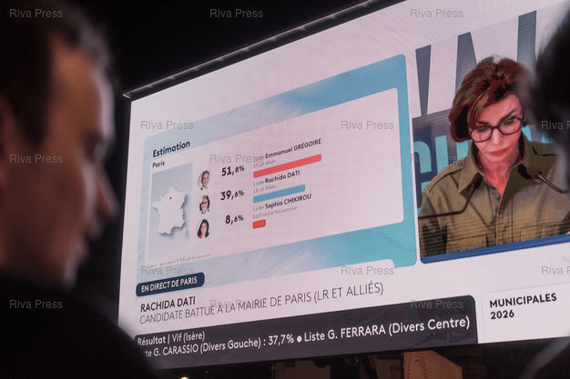 Légende : Emmanuel Gregoire, le candidat socialiste à la tête de l'union de la gauche pour les municipales de Paris, remporte l'election face a son opposante Rachida Dati (droite-centre) le 22 mars 2026. Paris, 22 mars 2026. Teo Manisier / Riva Press /// Emmanuel Gregoire, the Socialist candidate leading the left-wing coalition in the Paris mayoral election, defeated his opponent Rachida Dati (center-right) on March 22, 2026. Paris, March 22, 2026. Teo Manisier / Riva Press