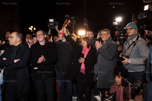 Légende : La desormais ancienne maire de Paris Anne Hidalgo accueille son successeur Emmanuel Gregoire, apres sa victoire aux elections municipales de Paris face a son opposante Rachida Dati (droite-centre) le 22 mars 2026. Paris, 22 mars 2026. Teo Manisier / Riva Press /// Anne Hidalgo, the now former mayor of Paris, welcomes her successor, Emmanuel Grégoire, following his victory in the Paris municipal elections over his opponent Rachida Dati (center-right) on March 22, 2026. Paris, March 22, 2026. Teo Manisier / Riva Press
