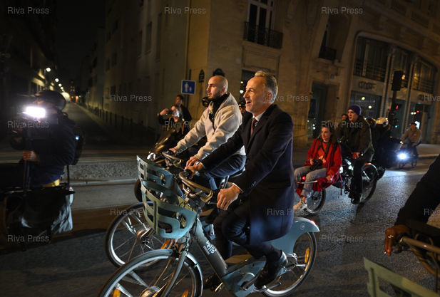 Légende : Emmanuel Grégoire, élu nouveau maire de Paris, célèbre sa victoire, et se rend à vélo à l'hôtel de ville /// Emmanuel Grégoire, elected the new mayor of Paris, celebrates his victory and goes by bike to the City Hall - Paris - 22/03/2026 - Photo © Lionel Préau +33 (0)6 68 12 83 77