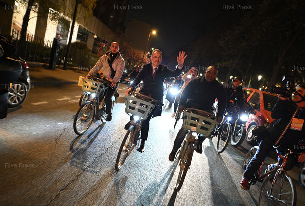 Légende : Emmanuel Grégoire, élu nouveau maire de Paris, célèbre sa victoire, et se rend à vélo à l'hôtel de ville /// Emmanuel Grégoire, elected the new mayor of Paris, celebrates his victory and goes by bike to the City Hall - Paris - 22/03/2026 - Photo © Lionel Préau +33 (0)6 68 12 83 77
