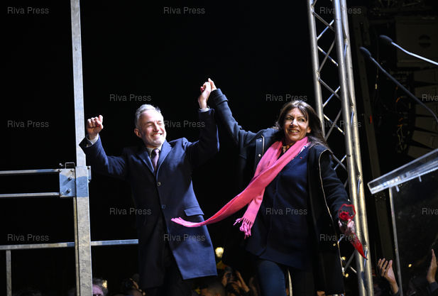 Légende : Emmanuel Grégoire, élu nouveau maire de Paris, célèbre sa victoire avec Anne Hidalgo devant l'hôtel de ville /// Emmanuel Grégoire, elected the new mayor of Paris, celebrates his victory with Anne Hidalgo in front of City Hall - Paris - 22/03/2026 - Photo © Lionel Préau +33 (0)6 68 12 83 77