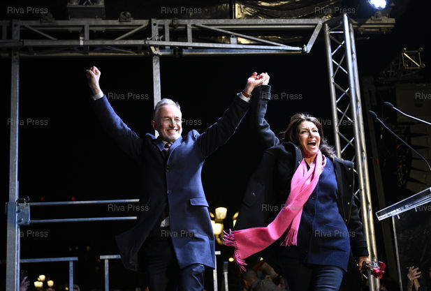 Légende : Emmanuel Grégoire, élu nouveau maire de Paris, célèbre sa victoire avec Anne Hidalgo devant l'hôtel de ville /// Emmanuel Grégoire, elected the new mayor of Paris, celebrates his victory with Anne Hidalgo in front of City Hall - Paris - 22/03/2026 - Photo © Lionel Préau +33 (0)6 68 12 83 77