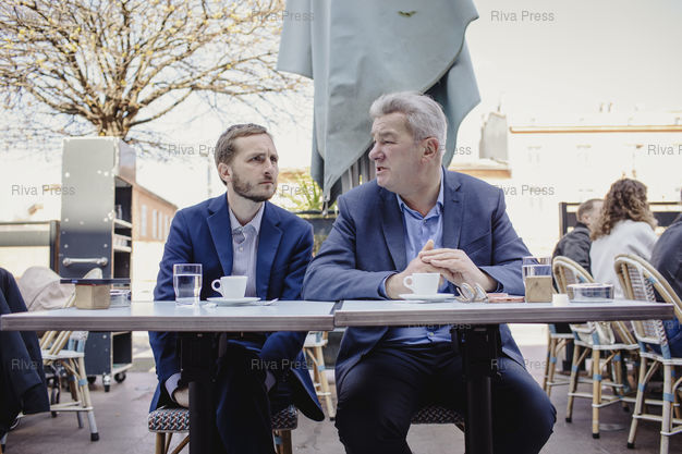 Légende : Toulouse, le 22 mars 2026 - François Piquemal (G), candidat La France Insoumise pour la liste Demain Toulouse La Gauche Unie pour le second tour des élections municipales est attablé à la terrasse d'un café avec son co-listier, le socialiste François Briançon avec lequel ils ont défini une liste commune d'union de la gauche au second tour contre le maire sortant de droite Jean-Luc Moudenc. PHOTO: Vincent NGUYEN / Riva Press