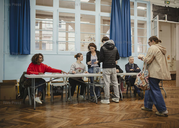 Légende : Toulouse, le 22 mars 2026 - Des électeurs votent au bureau de vote de l'école Fabre dans le quartier des Carmes à Toulouse le jour du second tour des élections municipales. PHOTO: Vincent NGUYEN / Riva Press
