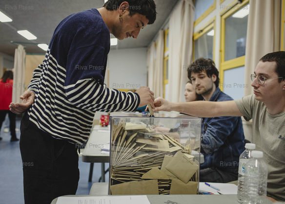 Légende : Toulouse, le 22 mars 2026 - Un électeur vote dans une urne électorale presque pleine dans un bureau de vote de l'école Bayard dans le quartier Matabiau à Toulouse le jour du second tour des élections municipales. PHOTO: Vincent NGUYEN / Riva Press