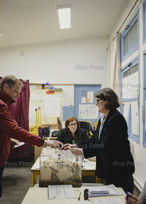 Légende : Toulouse, le 22 mars 2026 - Un électeur vote dans une urne électorale presque pleine dans un bureau de vote de l'école Bayard dans le quartier Matabiau à Toulouse le jour du second tour des élections municipales. PHOTO: Vincent NGUYEN / Riva Press