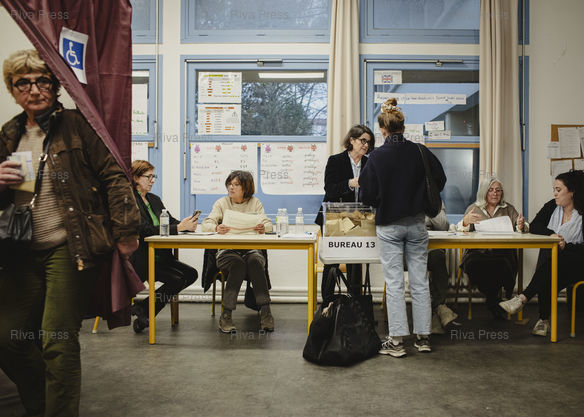 Légende : Toulouse, le 22 mars 2026 - Des électeurs votent dans un bureau de vote de l'école Bayard dans le quartier Matabiau à Toulouse le jour du second tour des élections municipales. PHOTO: Vincent NGUYEN / Riva Press