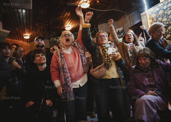 Légende : Toulouse, le 22 mars 2026 - Des militants réagissent aux résultats annoncés à la télévision en attendant celui de Toulouse au bar Le Winger où sont rassemblés les partisans du candidat LFI de la liste d'union de la gauche François Piquemal le soir du second tour des élections municipales. PHOTO: Vincent NGUYEN / Riva Press