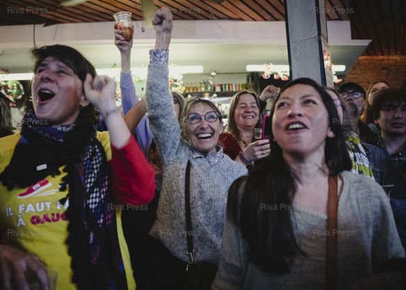 Légende : Toulouse, le 22 mars 2026 - Des militants réagissent aux résultats annoncés à la télévision en attendant celui de Toulouse au bar Le Winger où sont rassemblés les partisans du candidat LFI de la liste d'union de la gauche François Piquemal le soir du second tour des élections municipales. PHOTO: Vincent NGUYEN / Riva Press