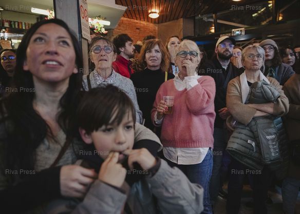 Légende : Toulouse, le 22 mars 2026 - Des militants réagissent aux premières estimations de la télévision qui annoncent une défaite de la gauche au bar Le Winger où sont rassemblés les partisans du candidat LFI de la liste d'union de la gauche François Piquemal le soir du second tour des élections municipales. PHOTO: Vincent NGUYEN / Riva Press