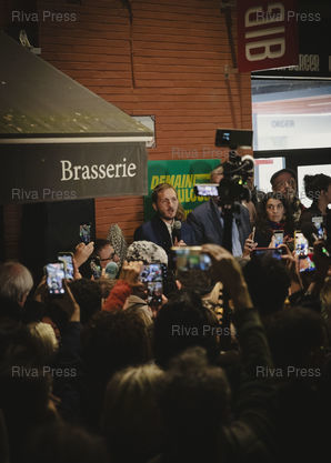 Légende : Toulouse, le 22 mars 2026 - François Piquemal, candidat LFI de la liste d'union de la gauche et François Briançon, son colistier socialiste font une déclaration devant le bar Le Winger où sont rassemblés leurs partisans pour la soirée électorale du second tour des élections municipales. PHOTO: Vincent NGUYEN / Riva Press