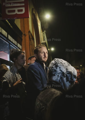 Légende : Toulouse, le 22 mars 2026 - François Piquemal, candidat LFI de la liste d'union de la gauche et François Briançon, son colistier socialiste font une déclaration devant le bar Le Winger où sont rassemblés leurs partisans pour la soirée électorale du second tour des élections municipales. PHOTO: Vincent NGUYEN / Riva Press