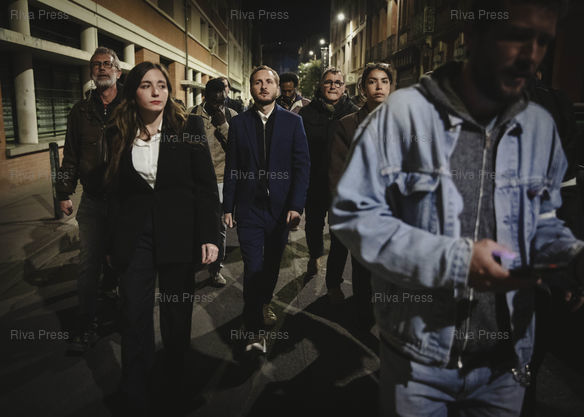 Légende : Toulouse, le 22 mars 2026 - François Piquemal, candidat LFI de la liste d'union de la gauche entouré de son équipe et de son service d'ordre le protégeant quitte le bar Le Winger où sont rassemblés ses partisans après avoir fait une déclaration suite à sa défaite au second tour des élections municipales. PHOTO: Vincent NGUYEN / Riva Press