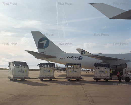 Légende : Débarquement d'ânes du refuge israélien 'Starting over' dont une partie viennent de Gaza à l'aéroport de Liège, spécialisé dans le transport de fret, cargo et marchandises. Le 10 novembre 2025. © Lucien Lung / Riva Press *** Donkeys from the Israeli animal sanctuary 'Starting Over,' some of which came from Gaza, were unloaded at Liege Airport, which specializes in freight, cargo, and goods transport. November 10, 2025. © Lucien Lung / Riva Press