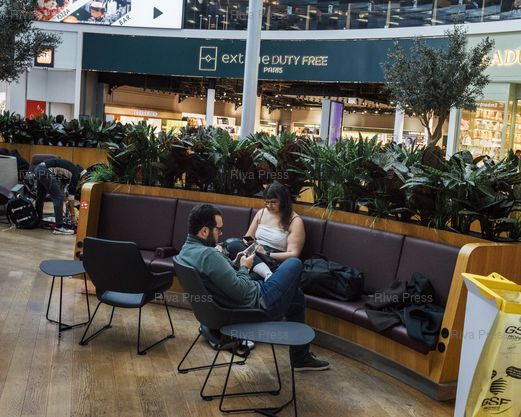 Légende : Des passagers patientent avant le départ de leur vol dans l'espace duty free, après les contrôles de sécurité. Terminal 4, aéroport d'Orly, le 25 février 2026. © Lucien Lung / Riva Press *** Passengers wait in the duty-free area before their flight departs, after passing through security. Terminal 4, Orly Airport, February 25, 2026. © Lucien Lung / Riva Press