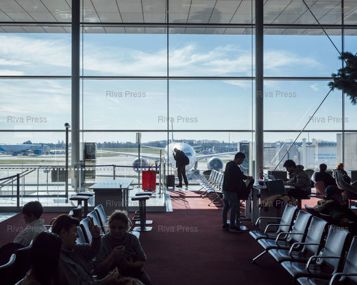 Légende : Des passagers patientent avant le départ de leur vol dans le hall d'embarquement du terminal 4 de l'aéroport d'Orly, le 25 février 2026. © Lucien Lung / Riva Press *** Passengers wait before their flight's departure in the departure hall of Terminal 4 at Orly Airport, February 25, 2026. © Lucien Lung / Riva Press