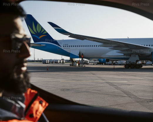 Légende : Hari Nadessin, responsable de l'activité système et management environnement exploitation, passe devant un Airbus A350-1000. Aéroport d'Orly, le 25 février 2026. © Lucien Lung / Riva Press *** Hari Nadessin, head of systems and environmental management operations, walks past an Airbus A350-1000. Orly Airport, February 25, 2026. © Lucien Lung / Riva Press