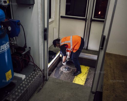 Légende : Ludwig Kravtcheck, technicien balisation arrière, intervient sur une piste de l'aéroport d'Orly. Le camion utilisé par les équipes de balisage est muni d'un trou à l'arrière, leur permettant lorsque nécessaire d'effectuer les réparations sans avoir à sortir du véhicule. 25 février 2026. © Lucien Lung / Riva Press *** Ludwig Kravtcheck, a rear runway lighting technician, works on a runway at Orly Airport. The truck used by the lighting teams has a hole in the rear, allowing them to carry out repairs without having to leave the vehicle when necessary. February 25, 2026. © Lucien Lung / Riva Press