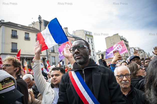 Légende : Des milliers de personnes sont rassemblees devant l'hotel de ville de Saint-Denis pour s'opposer au racisme a l'appel du maire nouvellement elu Bally Bagayoko (LFI), victime de nombreuses attaques racistes depuis son election. Au centre, Amadou Ka, adjoint au maire de Creil. Le 04/04/2026 /// Thousands of people are gathered in front of the Saint-Denis town hall to oppose racism at the call of the newly elected mayor Bally Bagayoko (La France Insoumise), who has been the victim of numerous racist attacks since his election. In the centre, Amadou Ka, deputy mayor of Creil. On April 4, 2026 /// PHOTO Vincent Boisot