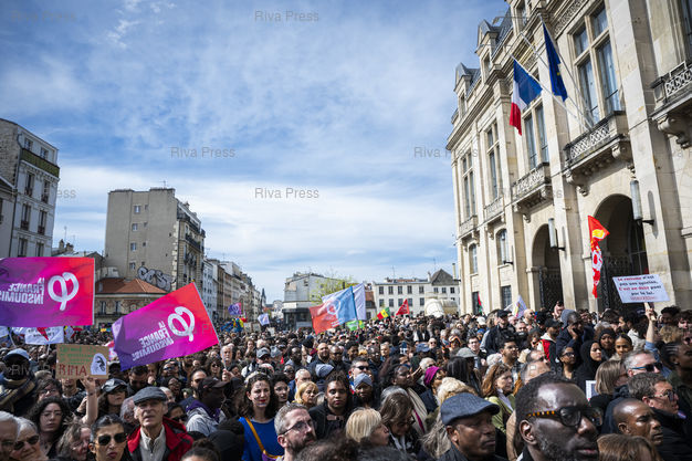 Légende : Des milliers de personnes sont rassemblees devant l'hotel de ville de Saint-Denis pour s'opposer au racisme a l'appel du maire nouvellement elu Bally Bagayoko (LFI), victime de nombreuses attaques racistes depuis son election. Le 04/04/2026 /// Thousands of people are gathered in front of the Saint-Denis town hall to oppose racism at the call of the newly elected mayor Bally Bagayoko (La France Insoumise), who has been the victim of numerous racist attacks since his election. On April 4, 2026 /// PHOTO Vincent Boisot