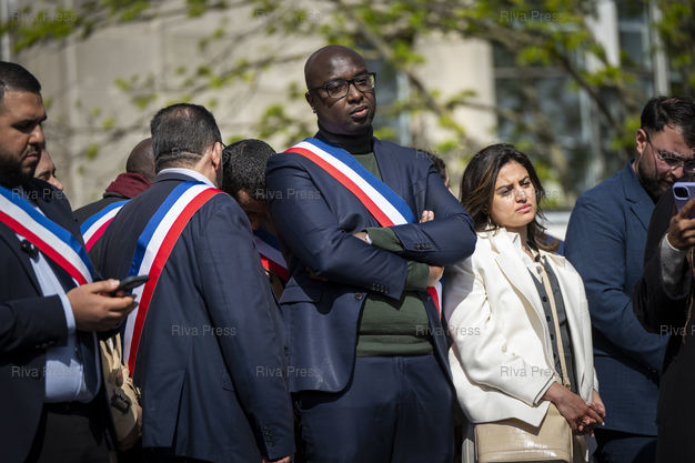 Légende : Des milliers de personnes sont rassemblees devant l'hotel de ville de Saint-Denis pour s'opposer au racisme a l'appel du maire nouvellement elu Bally Bagayoko (LFI), victime de nombreuses attaques racistes depuis son election. Au centre, Mohamed Gnabaly, maire de l'Ile-Saint-Denis depuis 2016 sur la tribune. Le 04/04/2026 /// Thousands of people are gathered in front of the Saint-Denis town hall to oppose racism at the call of the newly elected mayor Bally Bagayoko (La France Insoumise), who has been the victim of numerous racist attacks since his election. In the centre, Mohamed Gnabaly, mayor of Ile-Saint-Denis since 2016, on the podium. On April 4, 2026 /// PHOTO Vincent Boisot