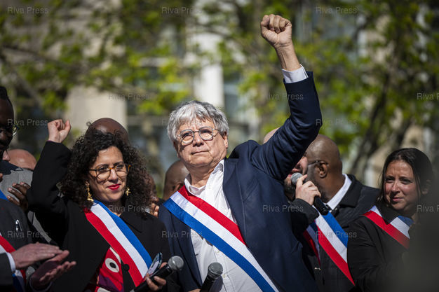 Légende : Des milliers de personnes sont rassemblees devant l'hotel de ville de Saint-Denis pour s'opposer au racisme a l'appel du maire nouvellement elu Bally Bagayoko (LFI), victime de nombreuses attaques racistes depuis son election. Sur la tribune, Eric Coquerel, depute LFI de Seine-Saint-Denis et Sofia Boutrih, conseillere municipale de Saint-Denis. Le 04/04/2026 /// Thousands of people are gathered in front of the Saint-Denis town hall to oppose racism at the call of the newly elected mayor Bally Bagayoko (La France Insoumise), who has been the victim of numerous racist attacks since his election. On the podium, Eric Coquerel, LFI member of parliament from Seine-Saint-Denis and Sofia Boutrih, municipal councilor for Saint-Denis. On April 4, 2026 /// PHOTO Vincent Boisot