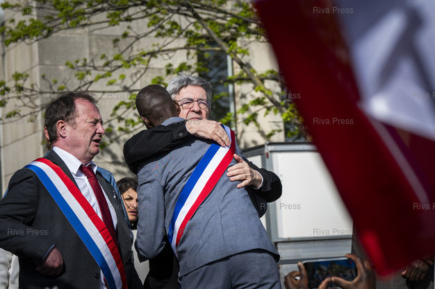Légende : Jean-Luc Melenchon enlace Bally Bagayoko pendant un rassemblement de plusieurs milliers de personnes devant l'hotel de ville de Saint-Denis pour s'opposer aux attaques racistes dont ce maire LFI nouvellement elu est victime depuis son election. Le 04/04/2026 /// Jean-Luc Melenchon embraces Bally Bagayoko during a gathering of several thousand people in front of the Saint-Denis town hall to oppose the racist attacks that this newly elected LFI mayor has been subjected to since his election. On April 4, 2026 /// PHOTO Vincent Boisot