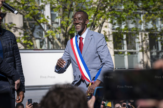 Légende : Bally Bagayoko, maire LFI nouvellement elu a Saint-Denis, esquisse quelques pas de danse sur la chanson "On lache rien" de Kaddour Hadadi devant plusieurs milliers de personnes rassemblees devant l'hotel de ville de Saint-Denis pour s'opposer aux nombreuses attaques racistes dont il est victime depuis son election. Le 04/04/2026 /// Bally Bagayoko, the newly elected LFI mayor of Saint-Denis, sketches a few dance steps to the song "On lache rien" by Kaddour Hadadi in front of several thousand people gathered in front of the Saint-Denis town hall to oppose the numerous racist attacks he has been subjected to since his election. On April 4, 2026 /// PHOTO Vincent Boisot