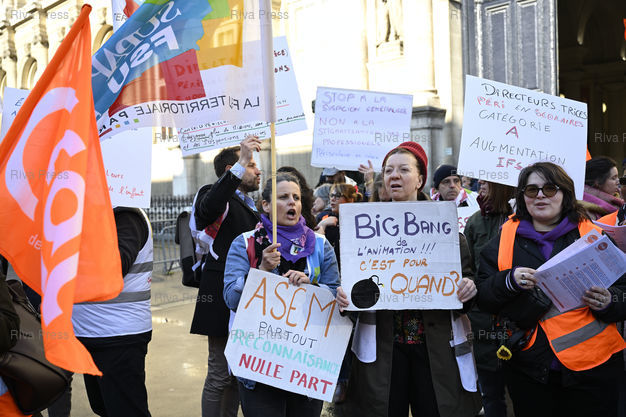 Légende : Des travailleurs du périscolaire se rassemblent devant l'Hôtel de Ville de Paris pour réclamer des moyens pour la protection des enfants, à l'occasion d'un Conseil de Paris extraordinaire dédié au périscolaire, alors que la mairie de Paris a été éclaboussée par des affaires de violences sexuelles /// After-school workers gathered in front of Paris City Hall to demand resources for child protection, during an extraordinary Paris Council meeting dedicated to after-school programs, at a time when the Paris City Hall has been embroiled in sexual violence cases - Paris - 14/04/2026 - Photo © Lionel Préau +33 (0)6 68 12 83 77