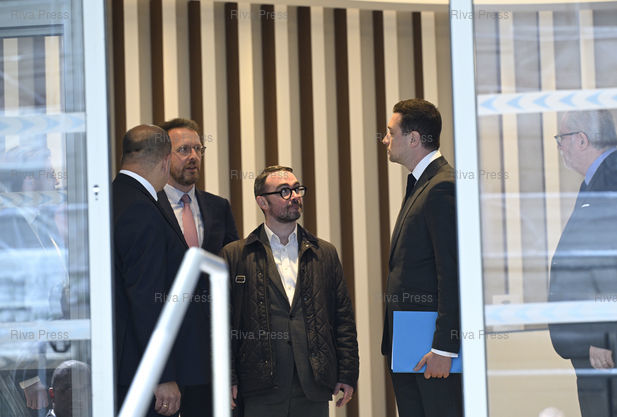 Légende : Jordan Bardella, président du Rassemblement National, parle à François Durvye, conseiller spécial, après un déjeuner avec le comité exécutif du Medef. En présence Victor Chabert /// Jordan Bardella, president of the Rassemblement National far right party, speaks to François Durvye, special advisor, after a lunch with the executive committee of the Medef. Between them, Victor Chabert - Paris - 20/04/2026 - Photo © Lionel Préau +33 (0)6 68 12 83 77