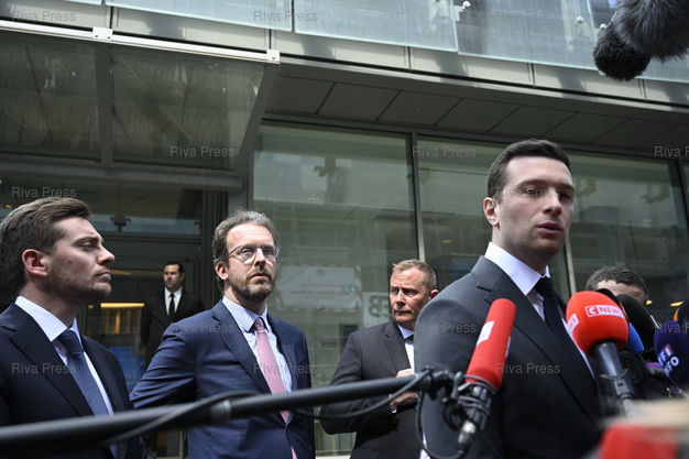 Légende : Jordan Bardella, président du Rassemblement National, s'exprime après un déjeuner avec le comité exécutif du Medef. En présence d'Alexandre Loubet, député, et François Durvye, conseiller spécial de Jordan Bardella /// Jordan Bardella, president of the Rassemblement National far right party, speaks after a lunch with the executive committee of the Medef (French Business Confederation). With Alexandre Loubet, MP, and François Durvye, special advisor of Jordan Bardella - Paris - 20/04/2026 - Photo © Lionel Préau +33 (0)6 68 12 83 77