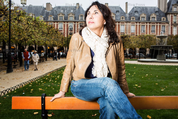 Légende : Rachel Kahn pose sur la place des Vosges. Paris, FRANCE-26/10/2012