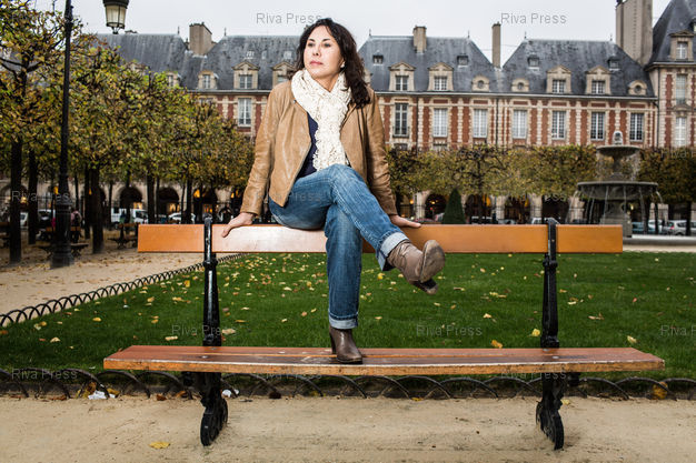Légende : Rachel Kahn pose sur la place des Vosges. Paris, FRANCE-26/10/2012