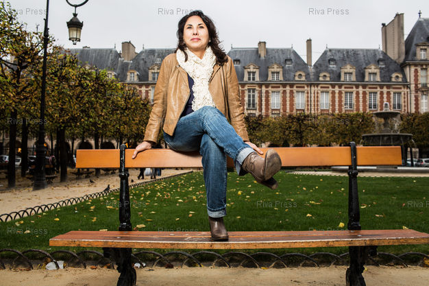 Légende : Rachel Kahn pose sur la place des Vosges. Paris, FRANCE-26/10/2012