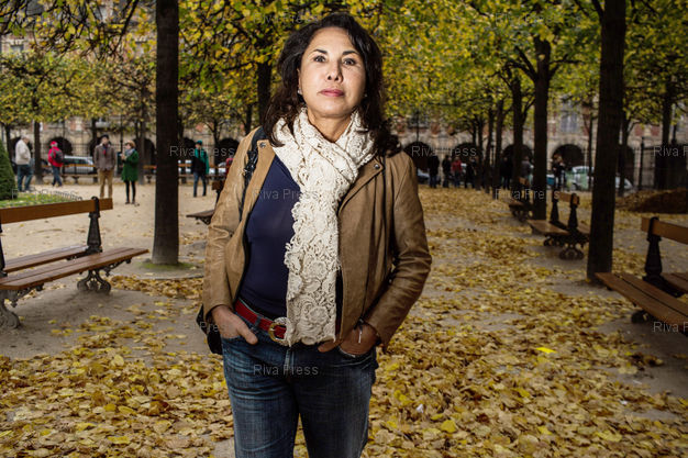 Légende : Rachel Kahn pose sur la place des Vosges. Paris, FRANCE-26/10/2012