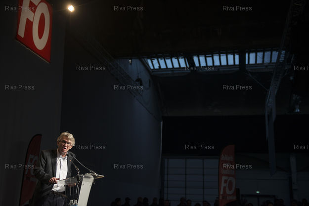 Légende : /2012 - PARIS, France - Jean-Claude Mailly, secretaire general de Force Ouvriere (FO), participe a un meeting contre l'austerite organise par son syndicat a la Halle Freyssinet. /// French general secretary of Force Ouvriere (FO) union takes part in a meeting against austerity organised at Halle Freyssinet in Paris. /// Photo Vincent BOISOT/Riva Press